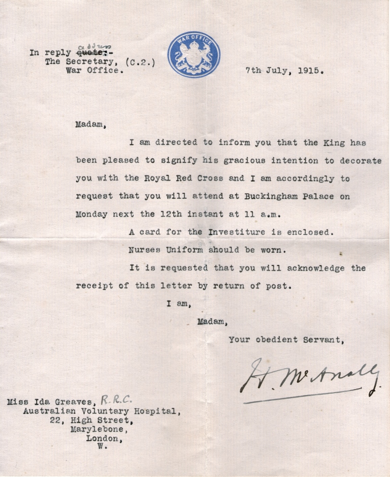 a long journey, and took Matron Ida Greaves RRC, a graduate of Newcastle Hospital, via the battlefields of northern France and the Australian Voluntary Hospital (AVH). This is the story of the day on which she was presented with the Royal Red Cross by George V, in her own words and related documents made available by her descendants: